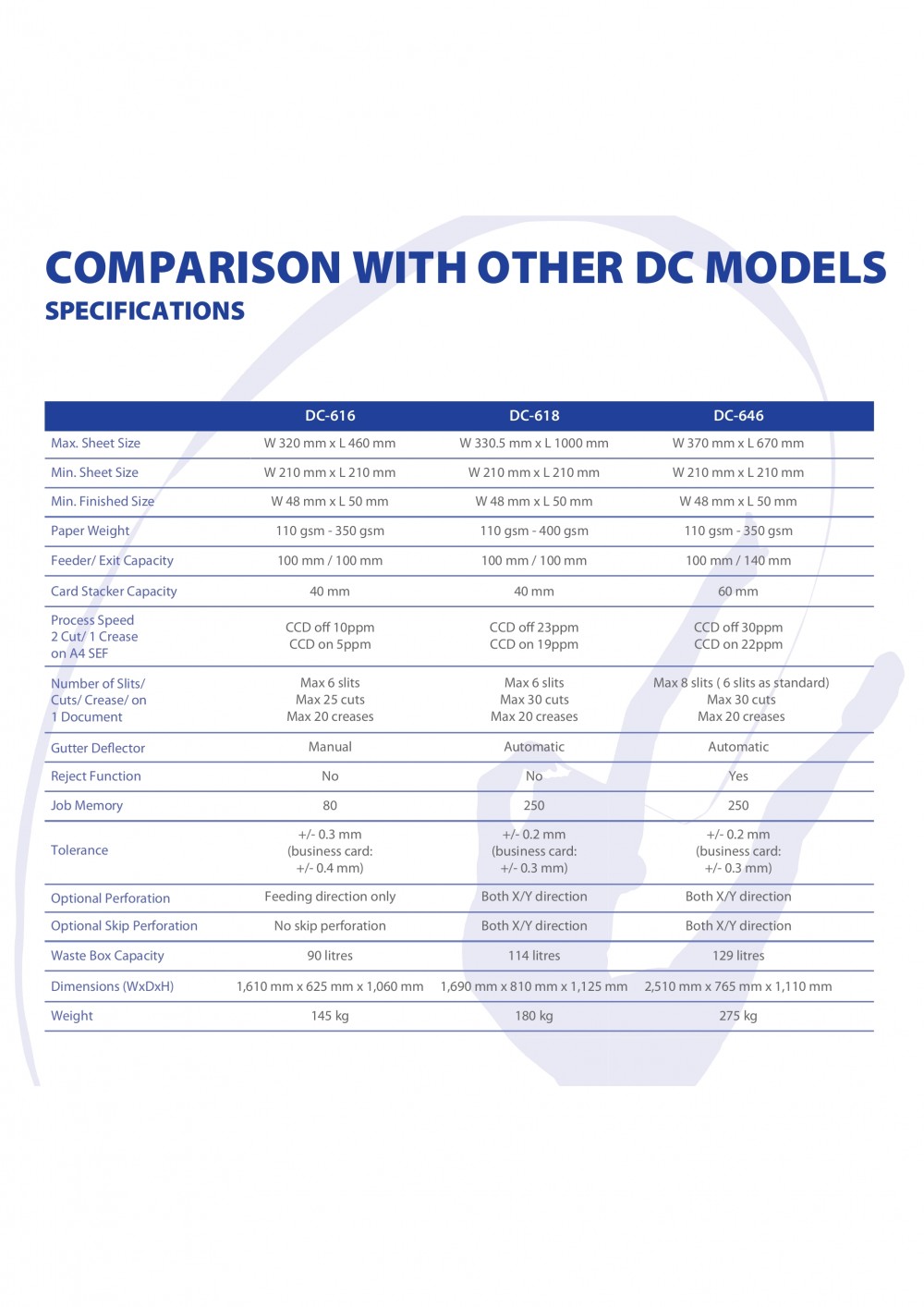 The DC-616 has been one of the most popular models within the Duplo range since its launch in 2014. Over the last six years, the market has evolved and so has the competition, so to enable us to keep ahead of the game within the Slitter, Cutter, Creaser market, Duplo is proud to announce the launch of the DC-618. A more powerful entry level model, with additional features and significantly improved specifications from the DC-616/616 Pro. The fully automated DC-618 Slitter/Cutter/Creaser is Duplo’s compact yet powerful all-in-one finishing solution designed for today’s digital printer. With the ability to process up to 6 slits, 30 cuts and 20 creases in one pass, the DC-618 delivers full-bleed applications up to 23 sheets per minute without the white borders and toner cracking for a clean finish. Produce an array of on-demand applications with ease including 21-Up business cards, gatefold invitations, direct mailers, brochures, book covers, and much more. Bring your finishing in-house!
