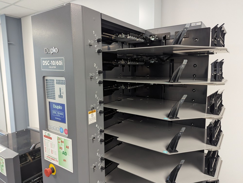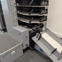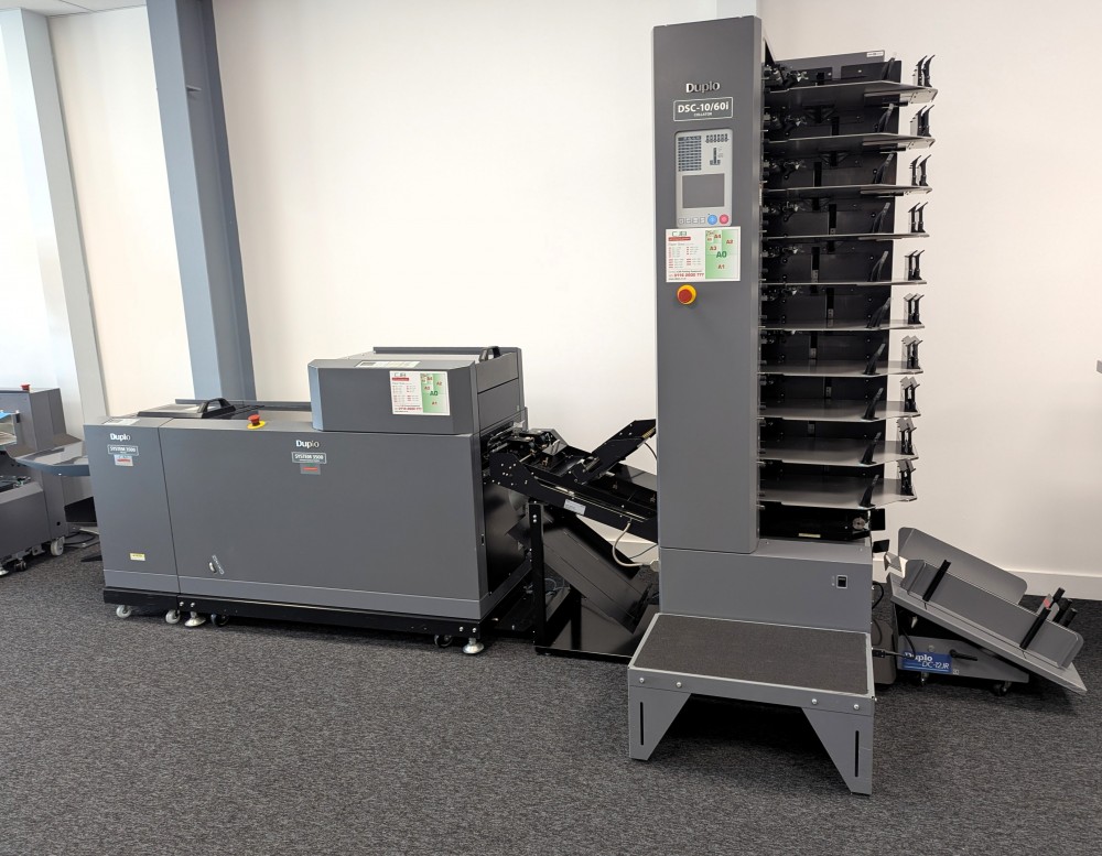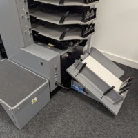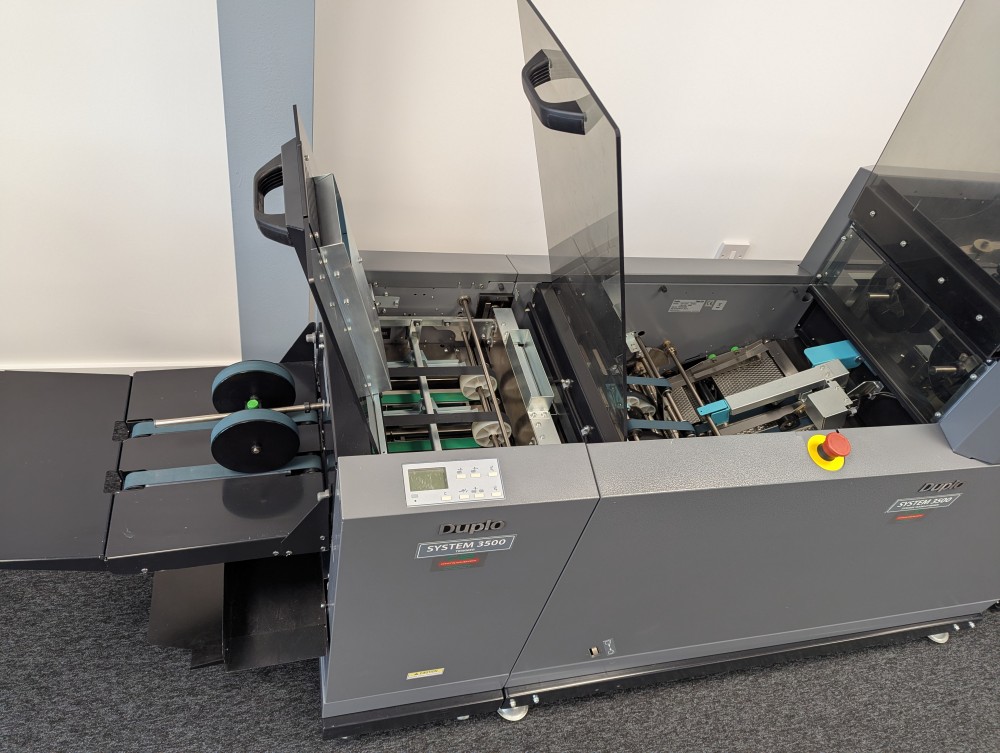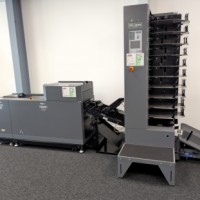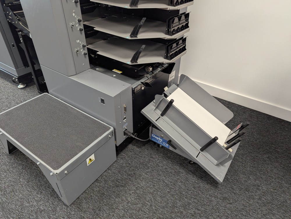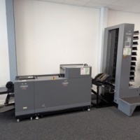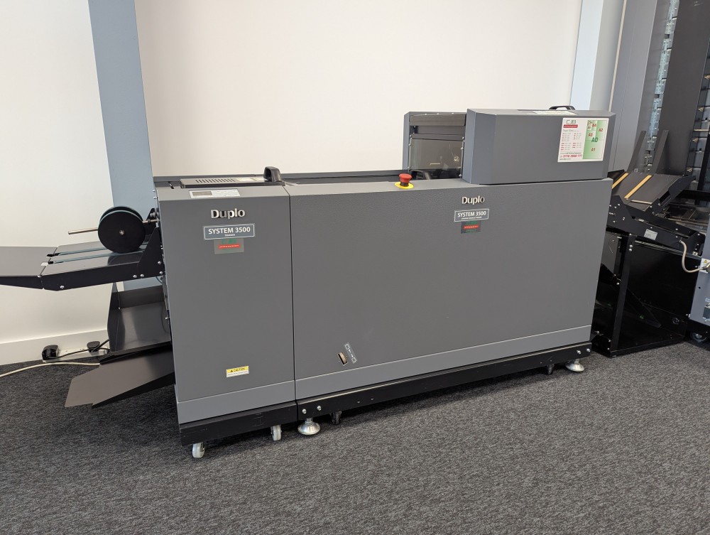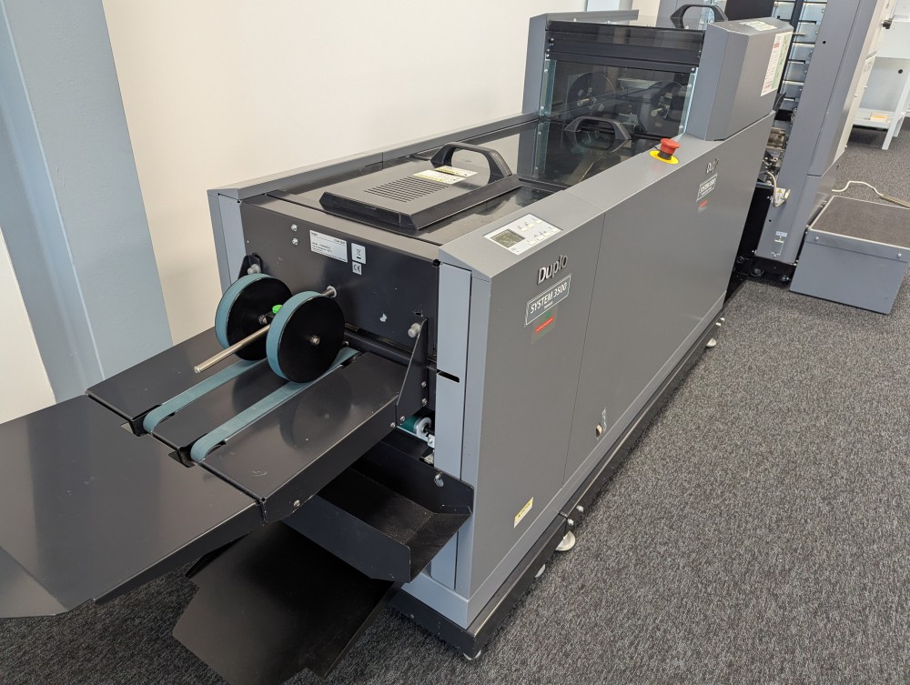 This Duplo 350 Booklet System consists of a DSC-10/60i 10 station suction fed collator, DBM-350 bookletmaker and trimmer. This system produces high quality booklets with its automated Deluxe stitching heads and integrated spine press. The 350 Booklet System also offers high productivity, creating booklets at 3000 A5 books per hour.