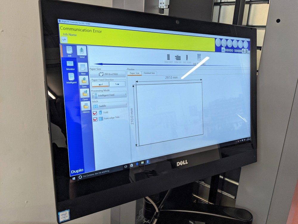 Automatically change over from a catalog to a CD-size booklet in under a minute using the PC Controller software. The PC Controller makes it incredibly simple for operators of any skill level to operate, program new jobs, and manage the settings of the entire system. The intuitive software guides operators step-by-step throughout the process and gives them complete control over the job parameters and adjustments to allow them to precisely set the stitch, fold, and trim positions. And with the ability to store virtually an unlimited number of jobs in the hard drive, users can instantly recall and change over jobs in less than 60 seconds!