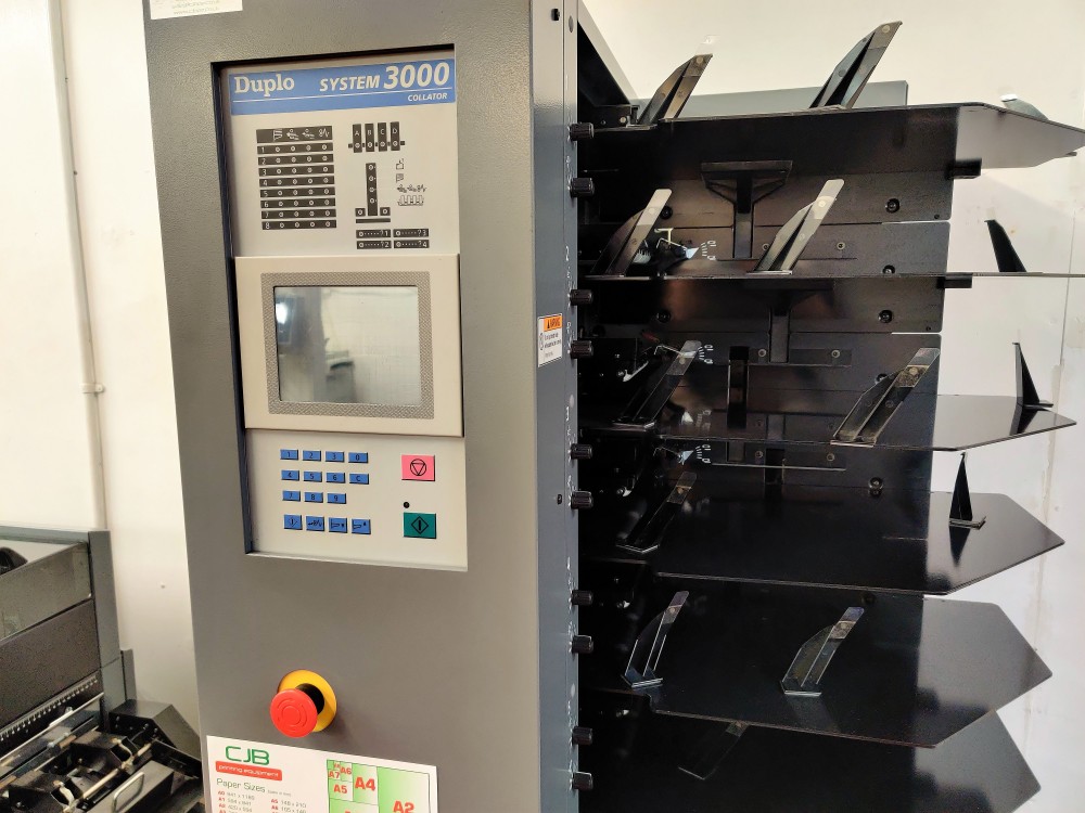 This 3500 Booklet System consists of the DC-8/32 8 station suction fed collator and DBM-350 bookletmaker and trimmer. This system produces high quality booklets with its automated Deluxe stitching heads and integrated spine press. The 350 Booklet System also offers high productivity, creating booklets at 3000 A5 books per hour.