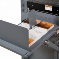 Margins trimmed horizontally by the slitter and vertically by the cutter, are automatically deposited into the large waste bin. Only the finished pieces are delivered into the exit tray. Creasing digitally-printed output prior to folding prevents toner cracking and unattractive fold lines. The creaser utilizes male and female matrix channels to create up to 20 creases across the sheet, enabling documents to be folded with ease. Creasing performance is optimized via the adjustable 3-step crease depth for various paper types and weights.