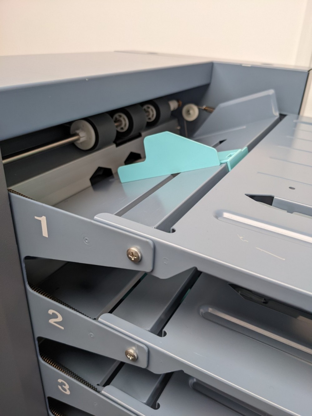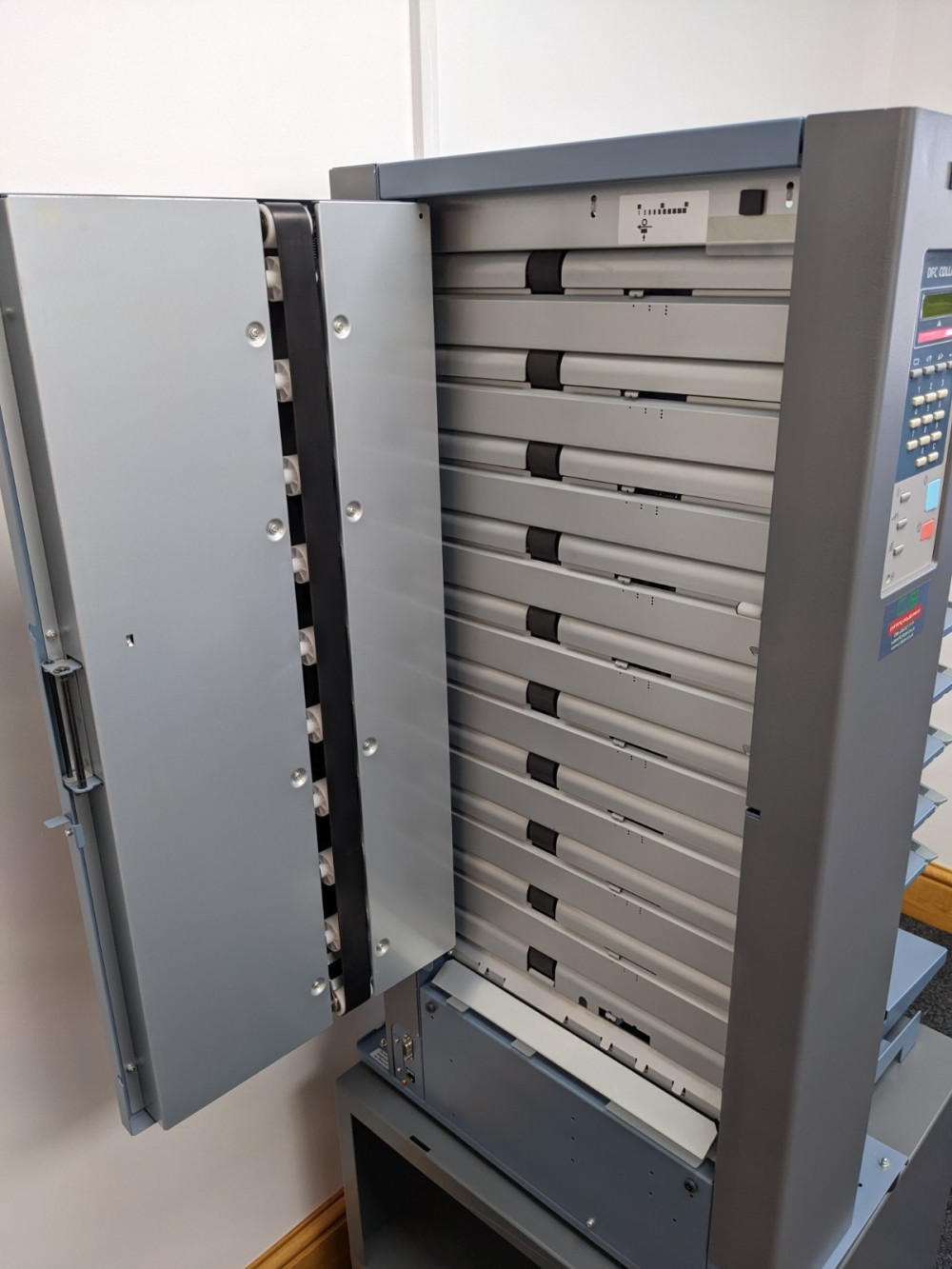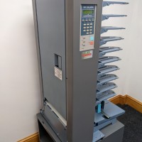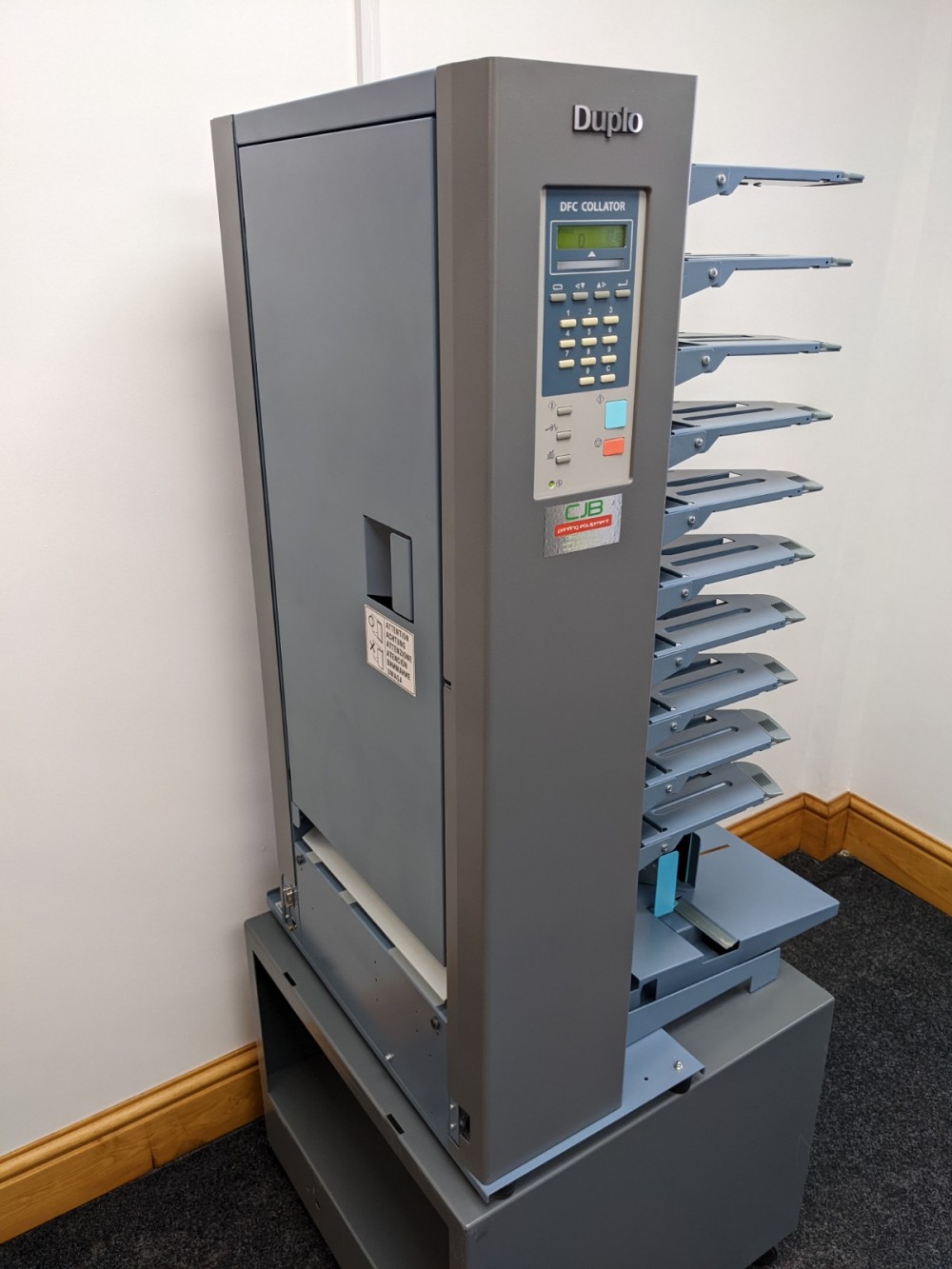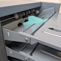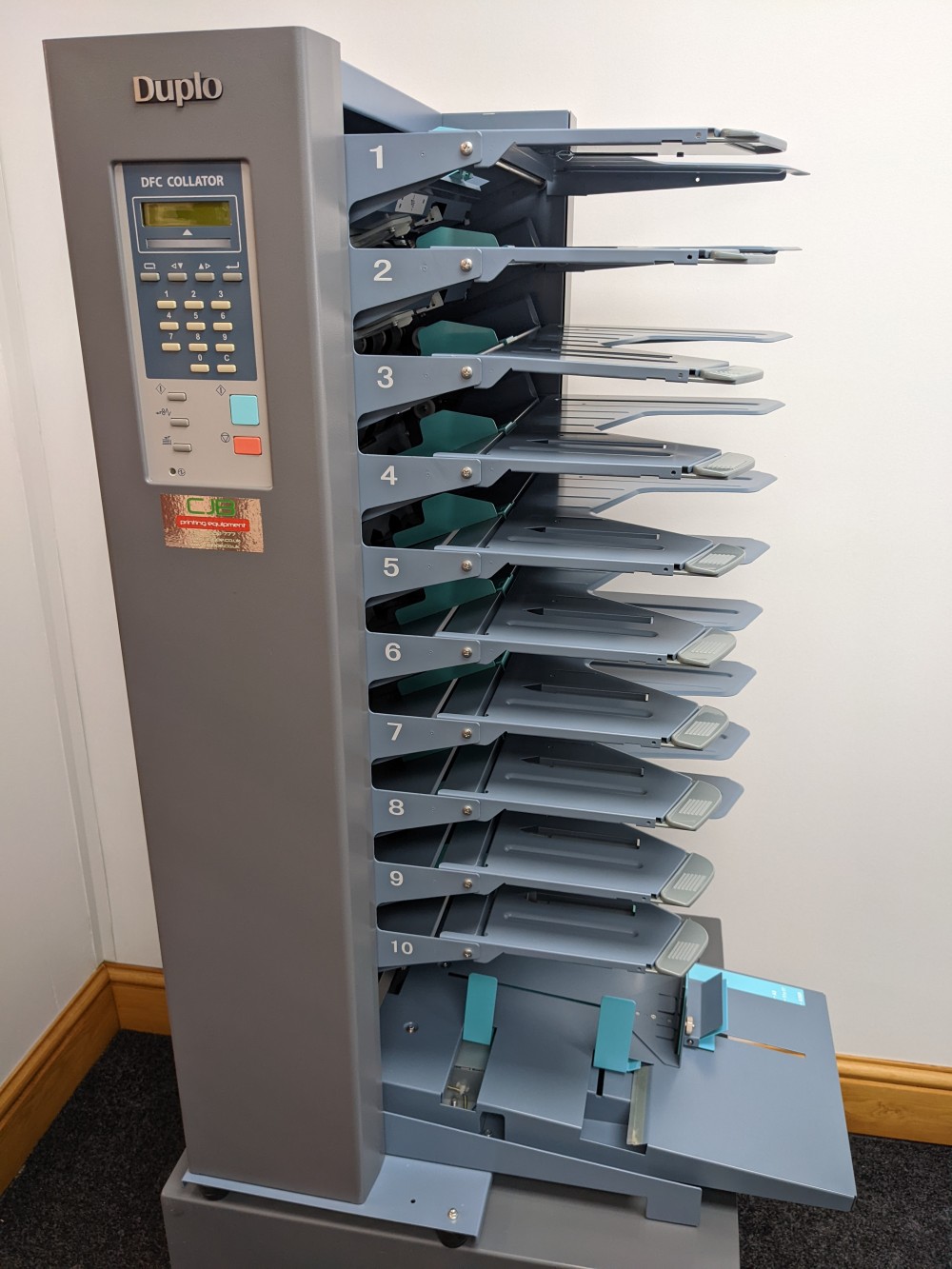 The DFC-100 friction collator is a bench-top friction fed collating unit which can build into a system with up to 20 stations by combining two units. The three-wheel feed system provides reliable feeding of a wide range of material, including certain coated stocks. A number of options increase the versatility of the DFC-100, including integration with the Duplo DBM-120 and DBM-150 bookletmaker.