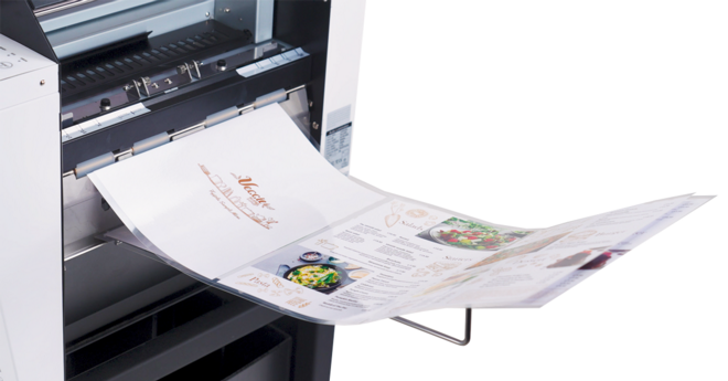Laminated sheets are consistently uniform and of high quality since the paper and film are already precision cut, margins and alignment are perfect. The HLA-2301 can trim from SRA3 down to A3 without the need for extra cutting reducing finishing processes and making the production of full bleed applications quickly and professionally.