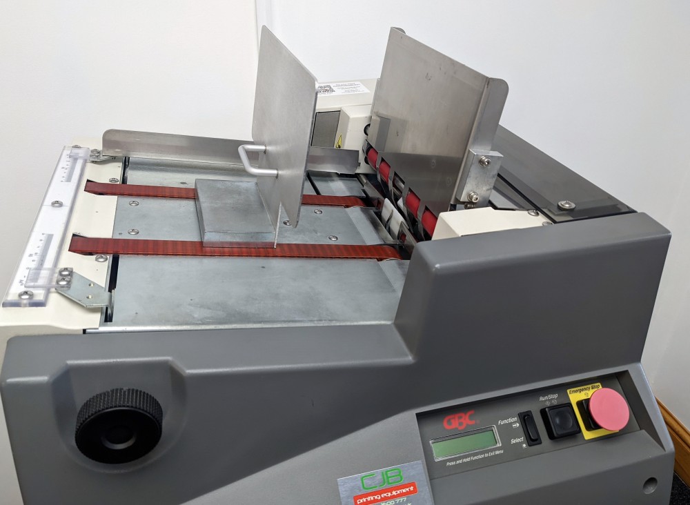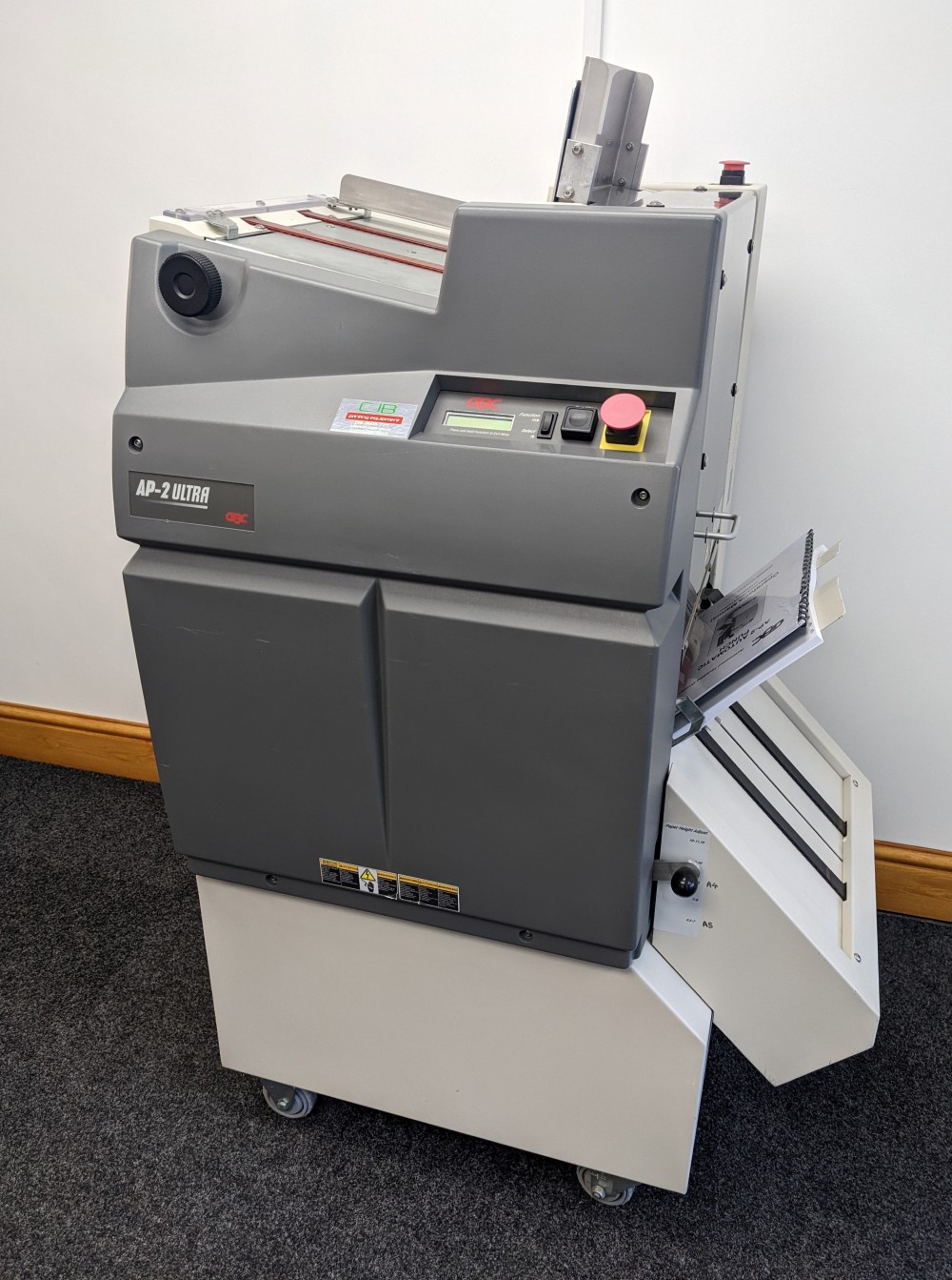 It operates with various paper sizes (A4, A5 landscape or portrait), types, index tabs and pre-collated covers. The AP-2 also has an LCD display for step by step instructions, side justifiers to align pages for punching.