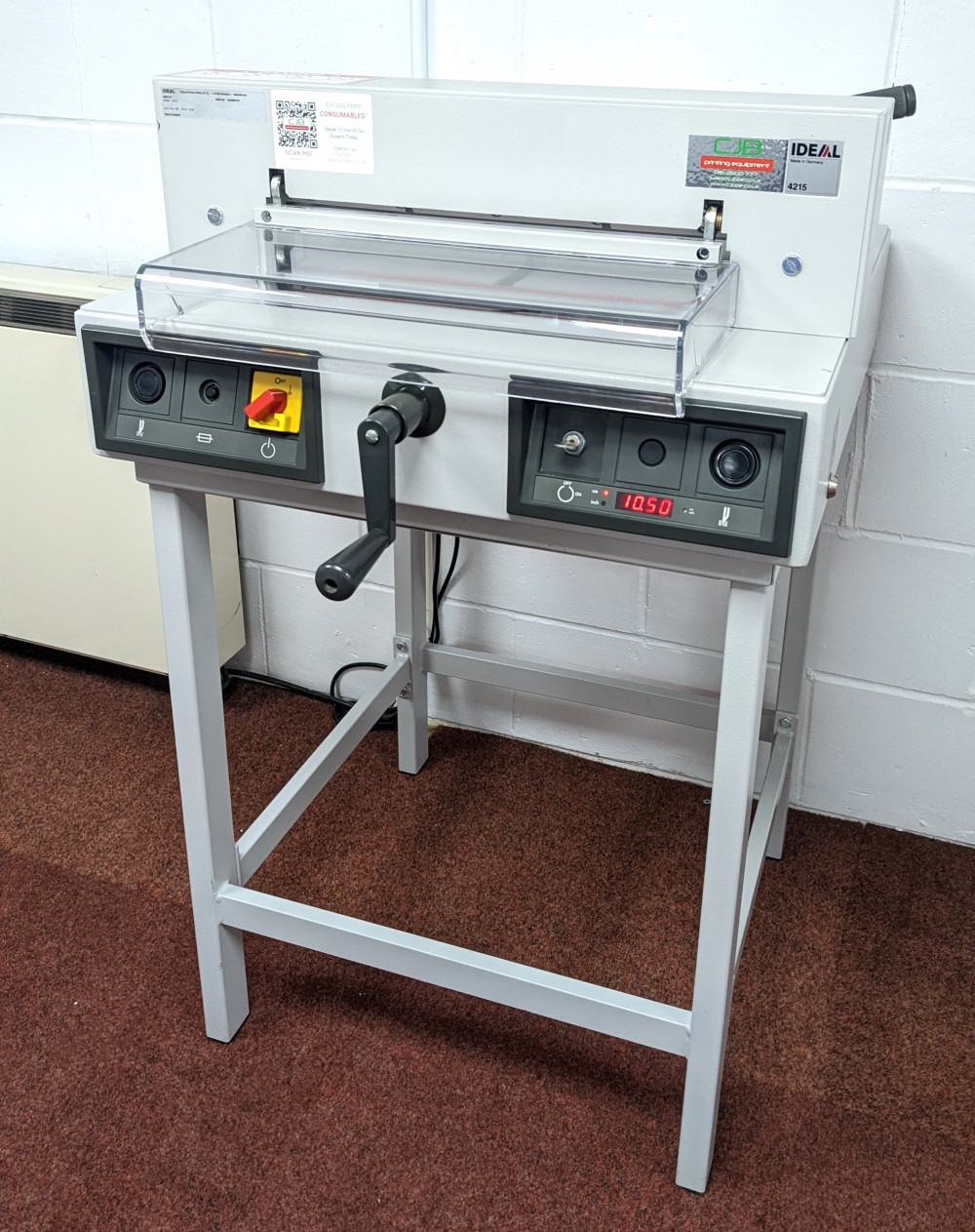 The IDEAL 4215 is the entry level bench top electric guillotine to handle formats up to A3. It includes the full IDEAL Safety Cutting System feature package which covers transparent hoods over front and rear tables, two-hand operation, and automatic blade return. The IDEAL 4215 has a maximum cut depth of 40mm for 500 sheets of paper, a fast action flick position clamp and hand operated back gauge with digital read out.