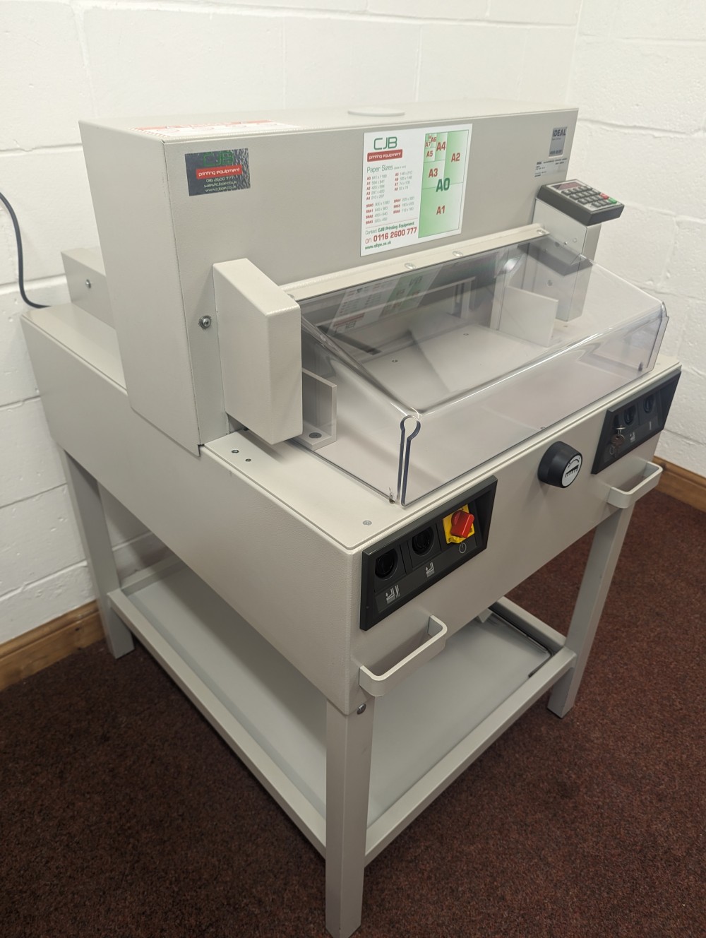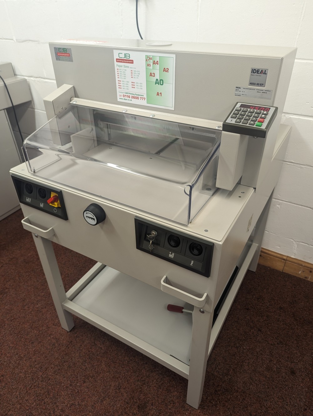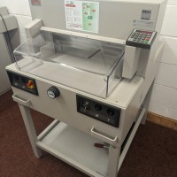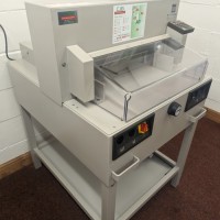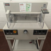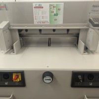 The IDEAL 4850-95 EP offers programmable control over the back gauge as well as automatic clamping and a power driven cutting blade. The program pad can store 9 cutting programs with up to 9 steps in each. A memory key can recall repeat cuts while non-standard job sizes can be entered via the key pad to control the back gauge. Manual setting is also possible using an electronic handwheel for the finest adjustments. Cutting position is checked using illuminated cutting line. A further program will activate the eject function to push out the paper after cutting.