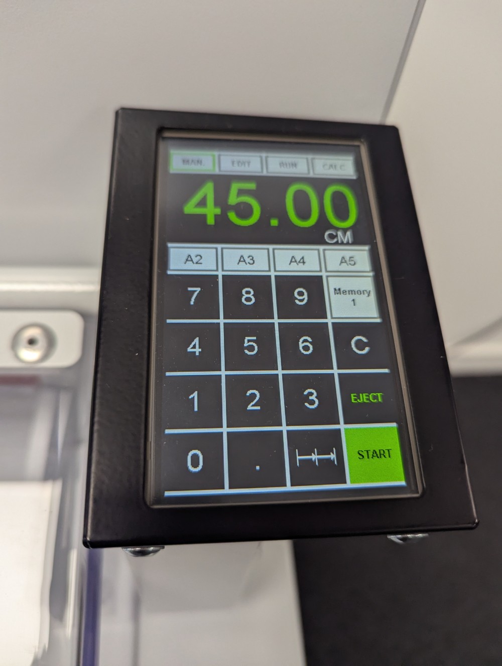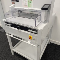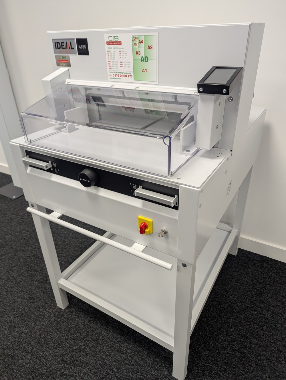 The Ideal 4855 is a feature rich and highly productive small format guillotine that is packed with professional features. The 4855 guillotine is highly accurate with both an optical cut line indicator, electronically controlled back gauge with fine adjustments possible using the infinitely variable back gauge control wheel. Safety is assured thanks to the 2 handed operation and Perspex safety guard.