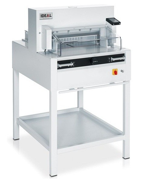 The Ideal 4855 is a feature rich and highly productive small format guillotine that is packed with professional features. The 4855 guillotine is highly accurate with both an optical cut line indicator, electronically controlled back gauge with fine adjustments possible using the infinitely variable back gauge control wheel. Safety is assured thanks to the 2 handed operation and Perspex safety guard.