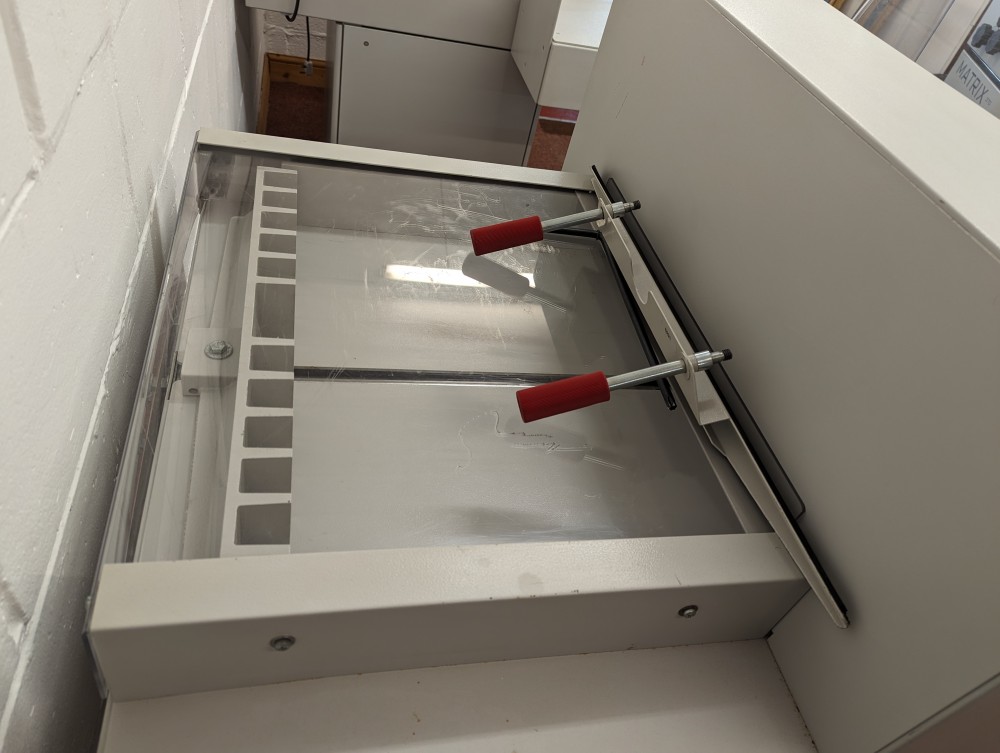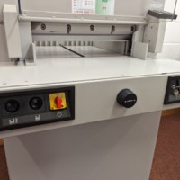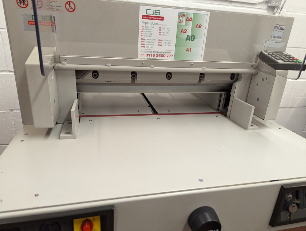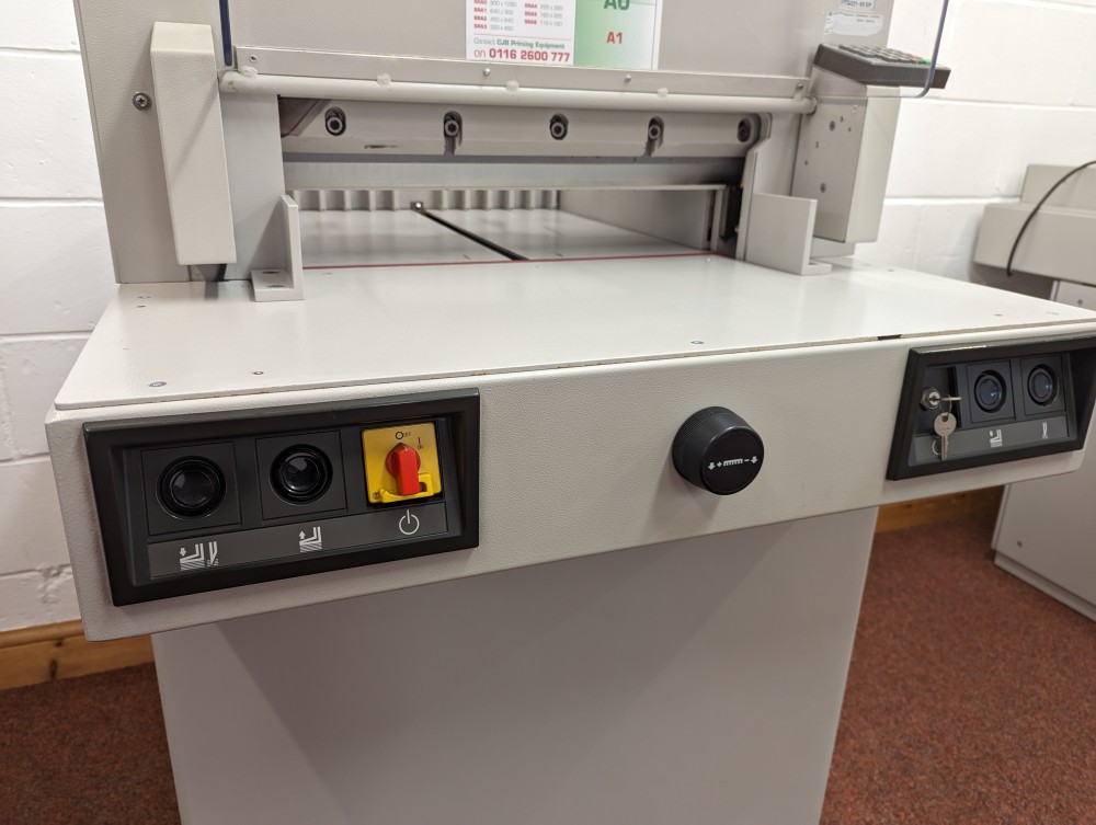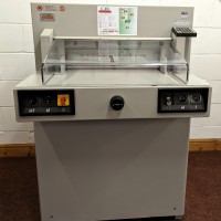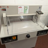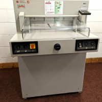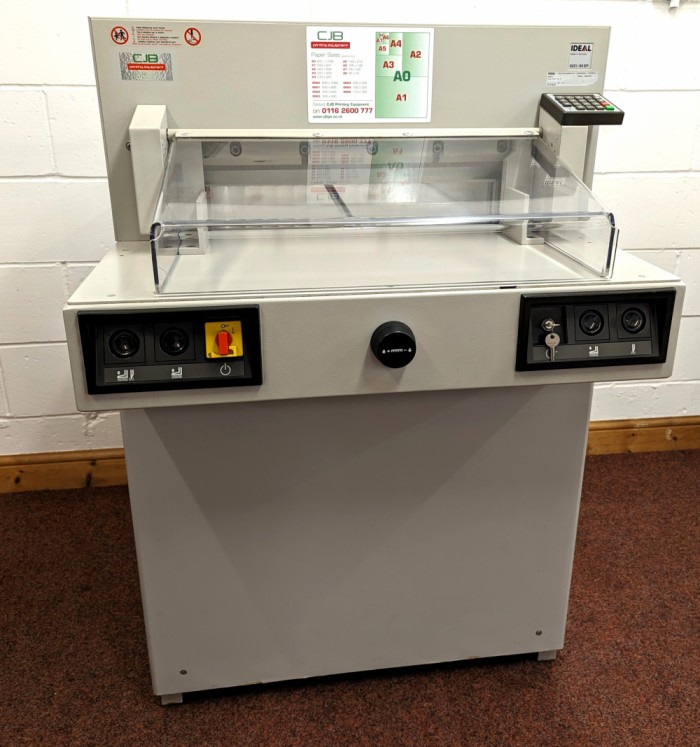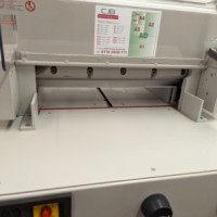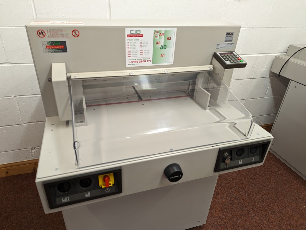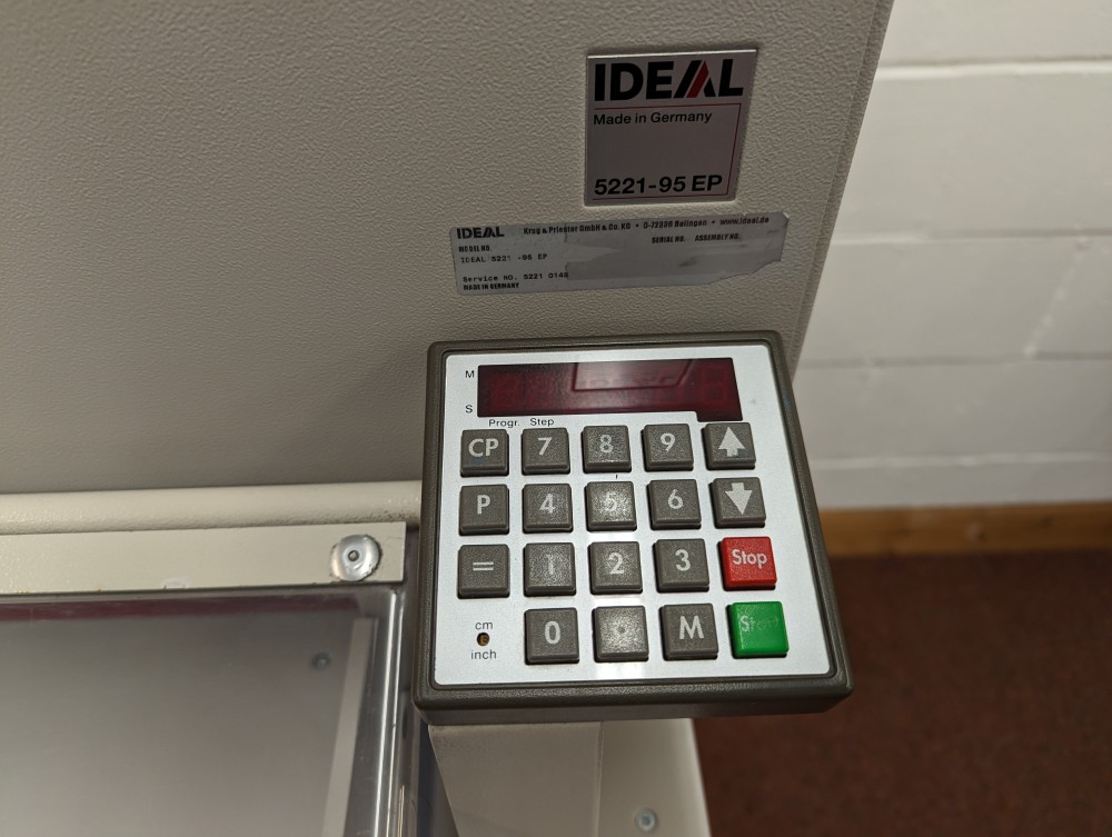 The IDEAL 5221-95 EP offers programmable control over the back gauge as well as automatic clamping and a power driven cutting blade. The program pad can store 9 cutting programs with up to 9 steps in each. A memory key can recall repeat cuts while non-standard job sizes can be entered via the key pad to control the back gauge. Manual setting is also possible using an electronic handwheel for the finest adjustments. Cutting position is checked using illuminated cutting line.