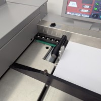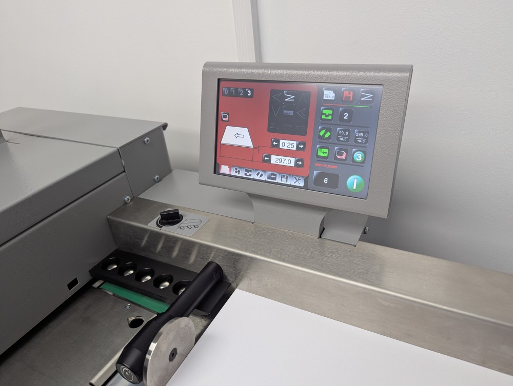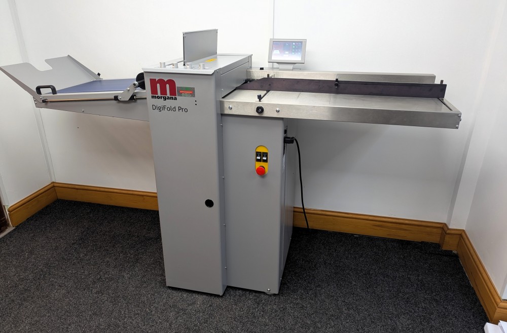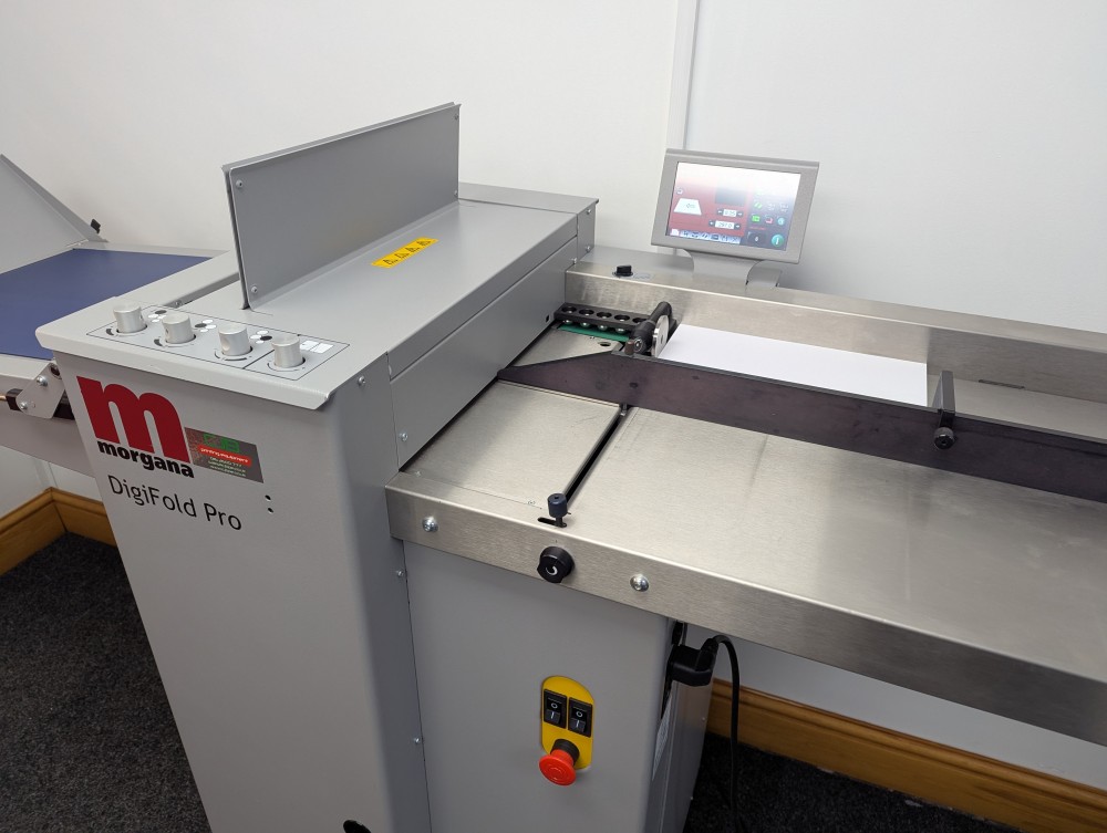 The DigiFold PRO features the increased speed, size, touch screen setup and perforating over the original Morgana DigiFold that has been on the market for 5 years. By incorporating yet more patented technology, the DynaCrease, Morgana has managed to increase the speed to over 6,000 letter size sheets per hour. Speed increase when running smaller sheets and is achieved by creasing the sheet without stopping it, yet maintaining an accuracy of +/-0.1mm. This speed is maintained irrespective of the number of creases being applied to the sheet. 9 sheets each with 9 creases can now be produced in less than 9 seconds!
