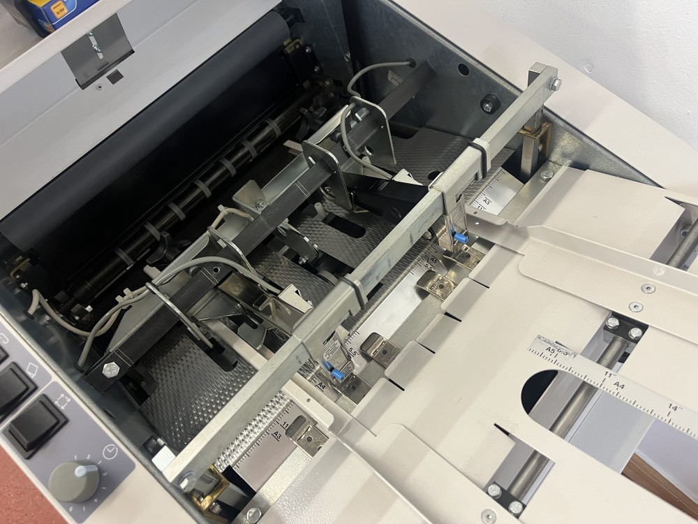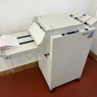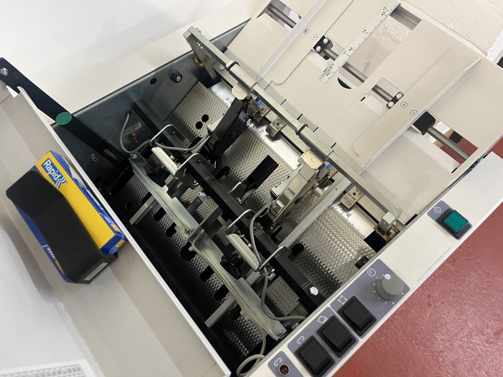 This machine is able to saddle staple and fold booklets of up to 22 sheets of 80gsm paper, giving up to 88 page booklets. Side and corner stapled documents can also be produced with this versatile machine. Sheets ranging from 60gsm to 250gsm and from SRA3 to A5 can be run to produce A6 to A4 sized booklets. Booklets with loop stapling can also be produced, by simply changing the stapler head.