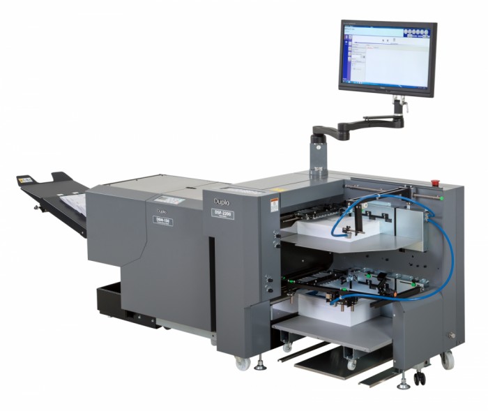 Duplo’s 150 Digital Booklet System is the combination of the world’s smallest fully automatic bookletmaker, the DBM-150 with the new generation DSF-2200 sheet feeder. It is an ideal near-line solution for low to mid volume digitally printed sheets. This System is configured to meet the ever changing demands of today’s digital printer and is designed to take printed output from multiple sources. Duplo has bundled the features of the big bookletmakers into this uniquely compact system.