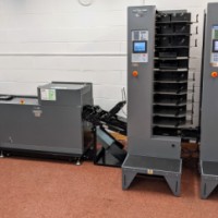 This 3500 Booklet System consists two DC-10/60 10 station suction fed collator, DBM-350 bookletmaker and trimmer and Squareback. This system produces high quality booklets with its automated Deluxe stitching heads and integrated spine press. The 350 Booklet System also offers high productivity, creating booklets at 3000 A5 books per hour.