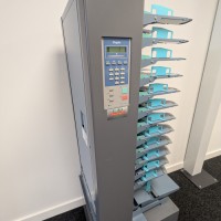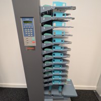 The DFC-120 friction collator is a bench-top friction fed collating unit which can build into a system with up to 24 stations by combining two units. The three-wheel feed system provides reliable feeding of a wide range of material, including certain coated stocks. A number of options increase the versatility of the DFC-100, including integration with the Duplo DBM-120 bookletmaker.