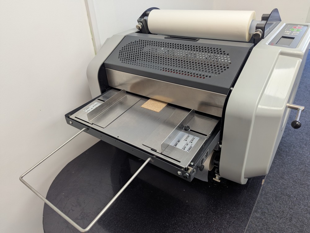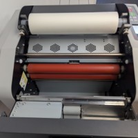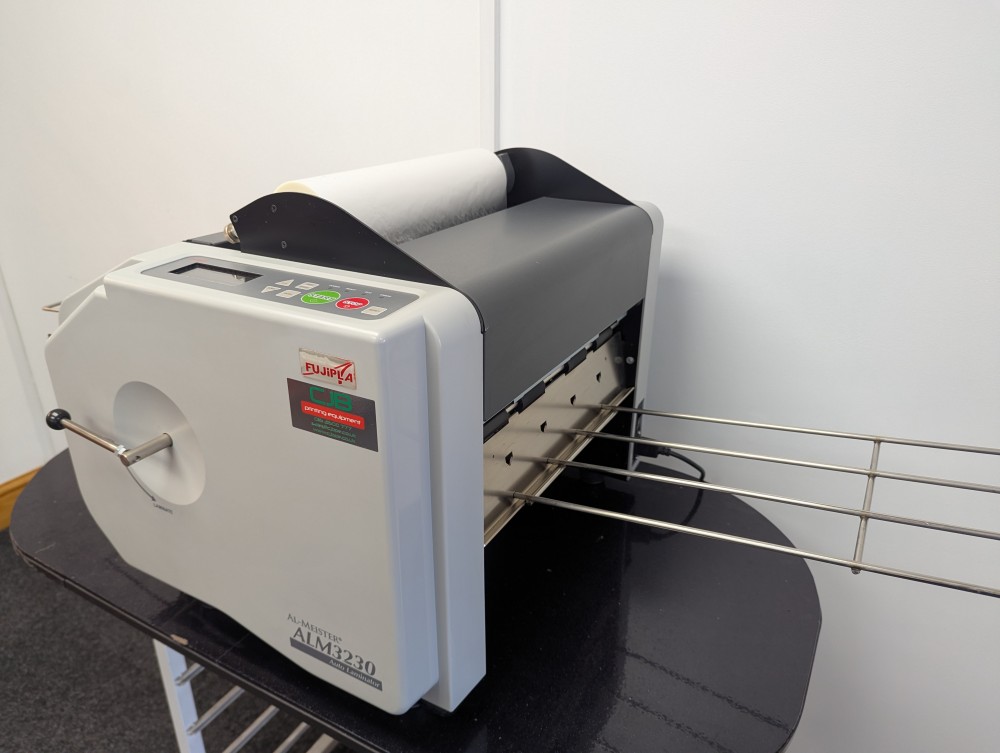 The most valuable aspect of the Fujipla ALM3230 is its ability to free up the operator's time; rather than sitting and watching each sheet feed, separating them individually and then trimming all four sides, the ALM3230 allows for virtually hands-free operation. Simply place your pages into the feeding tray (up to 100 at a time), adjust your margins to your desired length and width, press the start button and the machine will churn out perfectly trimmed and laminated sheets.