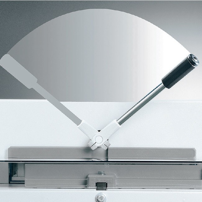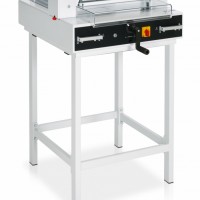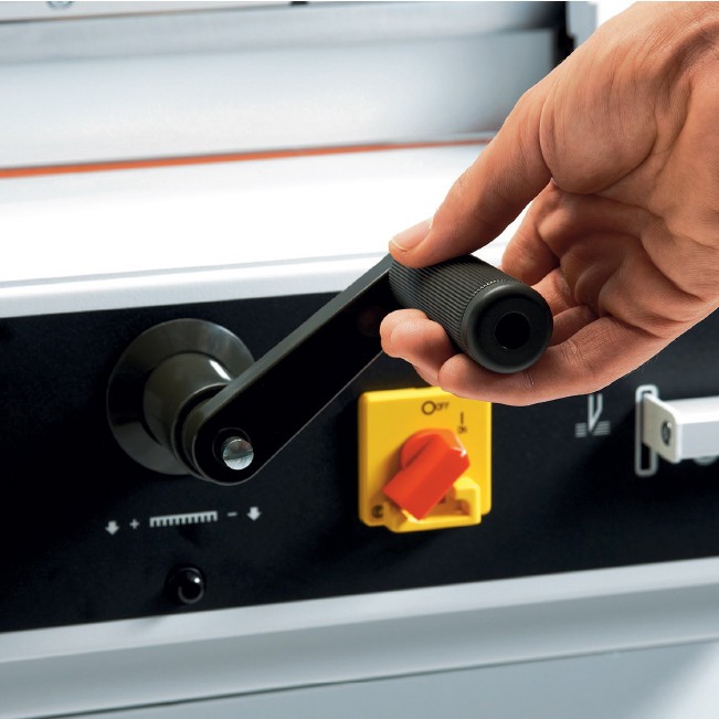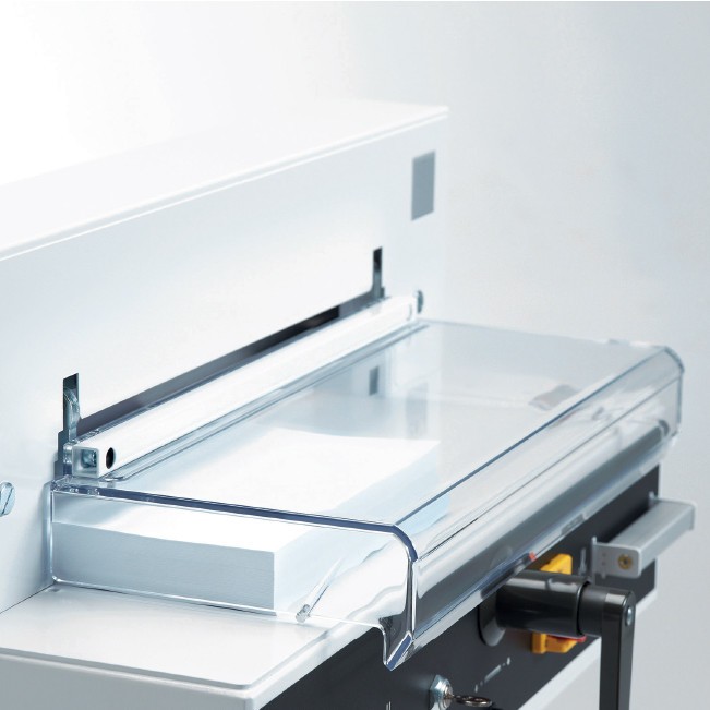 Transparent safety hoods guarantee safe operation with no loss of control over the cutting task. Flick action clamp helps ease of operation while digital read out on back gauge means accurate positioning of the stack for cutting. Illuminated cutting line provides further reassurance that positioning is accurate. Cutting stick removal from the side is safe and simple, while blade changeover is also a fail-safe operation.