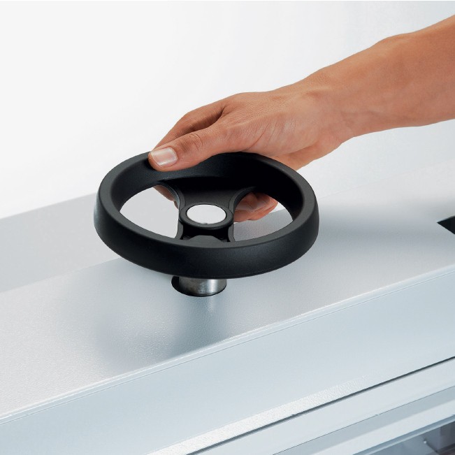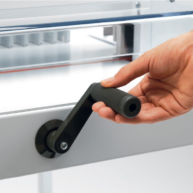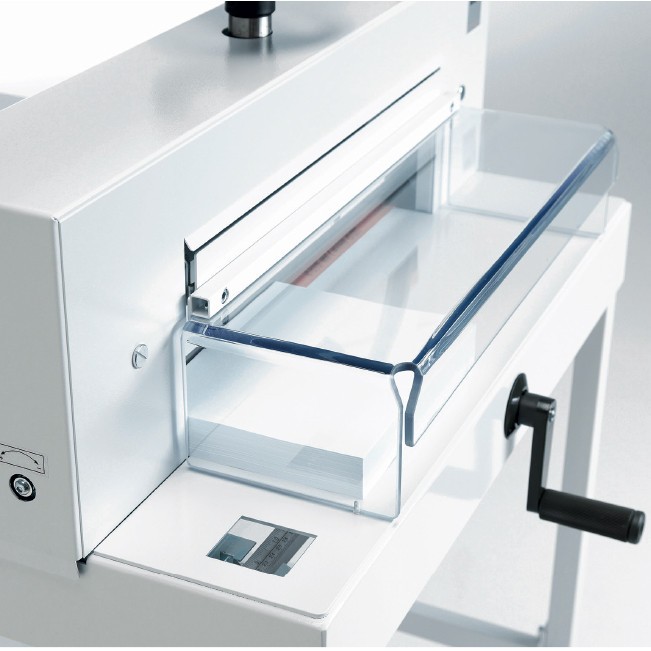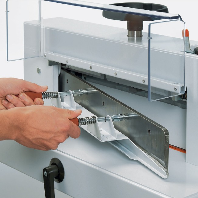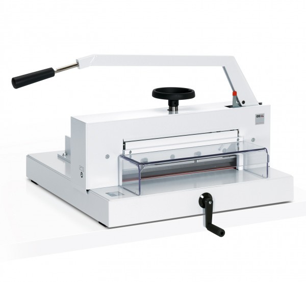 The safety features on the IDEAL 4705, including transparent safety guard which locks during cutting on the front table, transparent guard on the rear table, safety catch to lock the blade lever in its upper position, make the guillotine easy and reliable to operate. A calibrated hand crank with a large easy to read scale allows accurate position of the back gauge from the front table. The clamp is adjustable to give control over pressure on the stack to be cut. The knife change tool is designed with safety uppermost and the changeover can be carried out from the front of the machine. Likewise access to the cutting stick is from the outside of the machine. Adjustment to cutting depth is also from outside the machine.