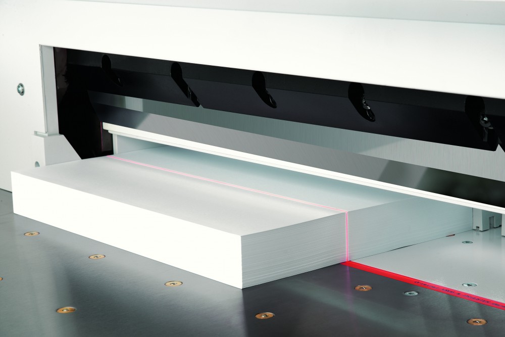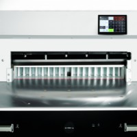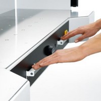 The air jet table makes light work of moving heavy stacks of paper, while programmable control and rapid back gauge movement make cutting complex jobs straightforward. Job settings can be stored for recall from a memory key. For delicate work the hydraulic clamp provides absolute control over the pressure applied to hold the stack while an optical cutting guide ensures that the stack is correctly lined up before cutting. An electronic handwheel offers precision control over back gauge movement. The swing cut action is gentler on the paper to give a true clean cut.